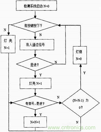 系統(tǒng)流程圖如圖5所示。其中N表示洗手間內(nèi)現(xiàn)有的人數(shù),當(dāng)檢測系統(tǒng)電源連上后,光電傳感器開始檢測,但系統(tǒng)不知道洗手間內(nèi)此時(shí)是否有人,默認(rèn)是無人,因而燈是不會(huì)亮的,這時(shí)按鍵可以用來對系統(tǒng)進(jìn)行調(diào)整。當(dāng)光強(qiáng)增大到一定值時(shí),檢測系統(tǒng)自動(dòng)停止工作。