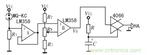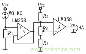 圖l中,R1是傳感器要求的負(fù)載電阻,阻值為120 Ω,Vcc為9 V電源電壓;A、B為LM358雙運(yùn)放,A為跟隨器,起緩沖隔離作用,以便將R1上的電壓VR1基本上全部施加到比較器B的同相輸入端。RW為報(bào)警靈敏度調(diào)整電位器。穩(wěn)態(tài)時(shí),調(diào)整RW使得加到比較器反相輸入端的電壓V-略高于穩(wěn)態(tài)時(shí)R1上的電壓VR1這個(gè)電壓越高,報(bào)警靈敏度就越低。加電并使傳感器達(dá)到穩(wěn)態(tài)后,MQ-KC為較穩(wěn)定的固定阻值,當(dāng)Vcc不變時(shí),VR1基本為一固定值,保持不變。當(dāng)有可燃性氣體泄露時(shí),傳感器接觸到可燃?xì)?,使其電?dǎo)率上升,電阻下降,使VR1上升,當(dāng)VR1高于V-時(shí),比較器輸出一個(gè)大于7 V的電壓,從而使蜂鳴器HA發(fā)出滴、滴的報(bào)警聲。若用該電壓控制一個(gè)繼電器,即可實(shí)現(xiàn)控制功能。為了提高抗干擾能力,可分別在R1和B的V-端并聯(lián)一只濾波電容。