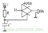 圖1所示的基本報(bào)警電路的不足:一開始加電時(shí),傳感器尚未達(dá)到穩(wěn)態(tài),其電阻值較小,VR1較大,導(dǎo)致蜂鳴器HA誤報(bào)警。為了解決這一問題,采用一個(gè)數(shù)字信號(hào)控制的模擬開關(guān),其控制信號(hào)采用簡單的電容充電延時(shí)電路,原理圖如圖2所示。圖1中比較器B的輸出V0加到模擬開關(guān)4066的輸入端,開關(guān)的輸出端接蜂鳴器HA。初始加電時(shí),電容C上的電壓VC為0,4066不導(dǎo)通,無論V0值為多高,HA都不會(huì)報(bào)警。隨著電容充電,VC不斷升高,當(dāng)達(dá)到4066的控制門限閾值時(shí),4066才導(dǎo)通,即能進(jìn)入報(bào)警狀態(tài)。電容充電使其電壓達(dá)到4066的控制門限閾值時(shí)間即為延時(shí)時(shí)間。電容C和電阻R的取值可根據(jù)延時(shí)要求確定。為可靠起見,取RC=1/2T,T為傳感器初始穩(wěn)定時(shí)間。本裝置取R=l MΩ,C=100μF,即能實(shí)現(xiàn)可靠的延時(shí)。