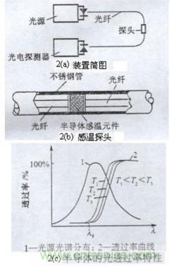 位圖2(a)為半導(dǎo)體吸光型(傳光型)光纖溫度傳感器示意圖。將一根切斷的光導(dǎo)纖維裝在細(xì)鋼管內(nèi),光纖兩端面間夾有一塊半導(dǎo)體感溫薄片(如GaAs或InP),這種半導(dǎo)體感溫薄片透射光強(qiáng)隨被測溫度而變化。因此,當(dāng)光纖一端輸入一恒定光強(qiáng)的光時,由于半導(dǎo)體感溫薄片透射能力隨溫度變化,光纖另一端接收元件所接受的光強(qiáng)也隨被測溫度而改變。于是通過測量光探測器輸出的電量,便能遙測到感溫探頭2(b)處的溫度。
