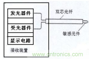 傳光型光纖傳感器中的光纖僅作為傳輸光的介質(zhì),只起傳輸光波的作用,對外界信息的“感覺”功能是依靠其它物質(zhì)的敏感元件來完成的,因此必須在光纖端面或中間加裝其它敏感元件才能構(gòu)成傳感器。這樣,傳感器中的光纖中間是中斷的、不連續(xù)的,中斷部分要接上其它介質(zhì)的敏感元件,如圖1所示。