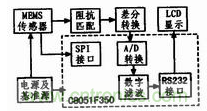 設計中采用C8051F350的24位Sigma-Delta模/數(shù)轉(zhuǎn)換器作系統(tǒng)信號的模數(shù)轉(zhuǎn)換,SPI接口作MEMS傾角傳感器的溫度采集,以實現(xiàn)對傳感器的溫度補償,UART作串行LED顯示接口。為保證模/數(shù)轉(zhuǎn)換器工作穩(wěn)定,采用外部基準源。