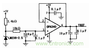 MEMS傾角傳感器SCA100T在傾角為0°時,模擬輸出為其電源電壓的1/2倍,如果傾角傳感器電源電壓有波動,則其輸出會產(chǎn)生相應的波 動。因此設計時,將給模數(shù)轉(zhuǎn)換電路提供基準源的輸出(如圖4所示),經(jīng)過提高驅(qū)動能力后,提供給MEMS傾角傳感器SCA100T作電源(如圖5所示)。 一方面,基準源輸出紋波極小,且性能穩(wěn)定;另一方面,模數(shù)轉(zhuǎn)換器的基準源和MEMS傾角傳感器SCA100T的電源同時向相同方向變化,抵消了MEMS傾 角傳感器因電源引起零點漂移的影響。