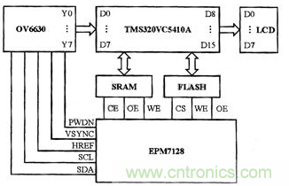 系統(tǒng)中的核心處理芯片選用TI公司的加強(qiáng)型定點(diǎn)DSP芯片TMS320VC5410A,該DSP的工作頻率可達(dá)160 MHz,內(nèi)部有64KBRAM空間可以靈活的映射為數(shù)據(jù)或程序存儲(chǔ)空間。由于DSP的內(nèi)部存儲(chǔ)空間有限,所以,本設(shè)計(jì)在外部擴(kuò)展了一大小為1 MB的SRAM數(shù)據(jù)存儲(chǔ)器CY7C1021和256 K的FLASH程序存儲(chǔ)器SST39VF400A??刂菩酒珻PLD選用Altera公司的MAX7000系列芯片EPM7128SLC84-15。該芯片包含84個(gè)I/O管腳、128個(gè)宏單元,每16個(gè)宏單元可組成一個(gè)邏輯陣列塊,工作電壓為5.0 V。該芯片在系統(tǒng)中處于總體時(shí)序控制地位,既用于給圖像傳感器芯片提供控制信號(hào)。也用于SRAM和FLASH的片選和讀寫(xiě)控制,同時(shí)還負(fù)責(zé)LCD的顯示控制。
