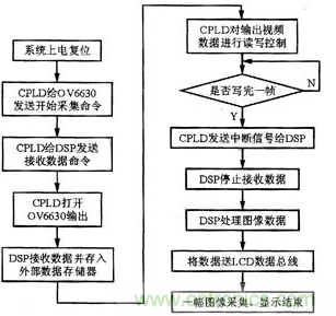 由于圖像像素點(diǎn)的個(gè)數(shù)已知,即數(shù)據(jù)個(gè)數(shù)已知,故在計(jì)數(shù)完畢后,CPLD將發(fā)出計(jì)數(shù)完畢信號(hào)。而DSP在接收到中止信號(hào)后,即可開(kāi)始讀取RAM中的數(shù)據(jù),并對(duì)數(shù)據(jù)進(jìn)行壓縮和相應(yīng)的處理,然后把數(shù)據(jù)放到LCD液晶屏的數(shù)據(jù)總線(xiàn),最后將采集到的圖像在液晶屏上顯示出來(lái)。圖3為圖像采集系統(tǒng)的軟件流程圖。