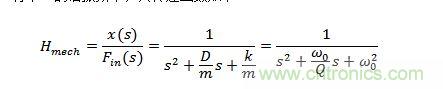 其中Fin(s)是輸入的力(在使用陀螺儀時是科里奧利力,在使用加速度計(jì)時是由于輸入加速產(chǎn)生的力)。x(s)是傳感器質(zhì)量塊對應(yīng)輸入力的位移。m是質(zhì)量塊的質(zhì)量,D是阻尼系數(shù),k是彈簧常數(shù)(剛度)。