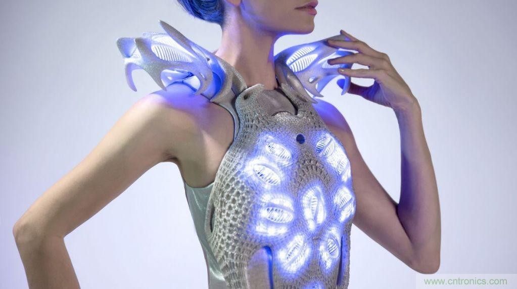 我們還可以通過肢體方面的一些表達來進行溝通,很顯然,要想充分利用人類的肢體語言,智能服飾是一個非常不錯的選擇。來自荷蘭的設(shè)計師Anouk Wipprecht就設(shè)計了一系列能夠通過生物特征識別技術(shù)來表達自身情緒的智能服裝。未來,我們可能會穿上一些帶有LED燈的類似盔甲之類的服裝,即使不說話也能表達自己的想法,不過我想應該會有人不喜歡這么奇怪的衣服。