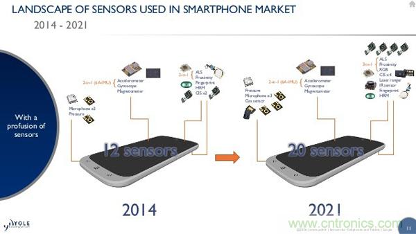 根據(jù)有關機構的預計,2014年智能手機內的平均傳感器數(shù)量為12顆,而到2021年這一數(shù)量將增加到20顆;除了一些必要的同類傳感器數(shù)量會增多之外,也有不少針對專業(yè)領域的機型會考慮搭載一些普通消費者無法想象的傳感器。