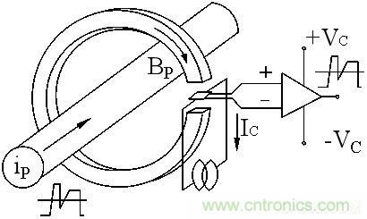 開環(huán)霍爾電流傳感器基于直測式霍爾原理,即開環(huán)原理(也稱只測試霍爾),原邊電流IP產(chǎn)生的磁通被高品質(zhì)磁芯聚集在磁路中,霍爾元件固定在很小的氣隙中,對磁通進行線性檢測,霍爾器件輸出的霍爾電壓經(jīng)過特殊電路處理后,副邊輸出與原邊波形一致的跟隨輸出電壓,此電壓能夠精確反映原邊電流的變化。原理圖及外形如下: