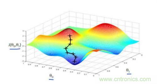 以上我們是以一維數(shù)據(jù)來看梯度下降,但我們的照片是多維數(shù)據(jù),此時(shí)如何求導(dǎo)數(shù)?又如何梯度下降呢?此時(shí)我們需要用到偏導(dǎo)數(shù)的概念。其實(shí)它與導(dǎo)數(shù)很相似,因?yàn)閤是多維向量,那么我們假定計(jì)算Xi的導(dǎo)數(shù)時(shí),x上的其他數(shù)值不變,這就是Xi的偏導(dǎo)數(shù)。此時(shí)應(yīng)用梯度下降法就如下圖所示,θ是二維的,我們分別求θ0和θ1的導(dǎo)數(shù),就可以同時(shí)從θ0和θ1兩個(gè)方向移動(dòng)相應(yīng)的步長,尋找最低點(diǎn),如下圖所示: