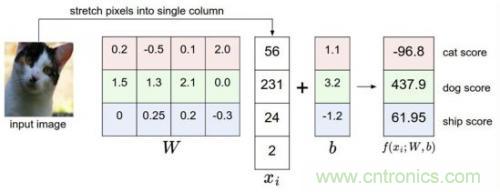 比如我們有訓(xùn)練數(shù)據(jù)集照片對應(yīng)著cat、dog、ship三個(gè)類別,某個(gè)輸入照片經(jīng)過函數(shù)f(x)=x*W+b,前向運(yùn)算得到該照片屬于這3個(gè)分類的得分值。此時(shí),這個(gè)函數(shù)被稱為得分函數(shù),如下圖所示,假設(shè)左邊關(guān)于貓的input image是一個(gè)4維向量[56,231,24,2],而W權(quán)重是一個(gè)4*3的矩陣,那么相乘后再加上向量[1.1,3.2,-1.2]可得到在cat、 dog、ship三個(gè)類別上的得分: