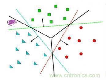 給定隨機(jī)數(shù)作為a,c,b的初始值,我們通過訓(xùn)練數(shù)據(jù)不斷的優(yōu)化參數(shù)a,b,c,把不合適的L1、L3等分類函數(shù)逐漸訓(xùn)練成L2,這樣的L2去面對泛化的測試數(shù)據(jù)就可能獲得更好的效果。然而如果有多個(gè)類別,就需要多條分類直線才能分出,如下圖所示: