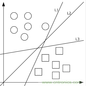 由清晰的人臉照轉(zhuǎn)化出的像素值矩陣,應(yīng)當(dāng)設(shè)計(jì)出什么樣的函數(shù)f(x)轉(zhuǎn)化為特征值呢?這個(gè)問題的答案依賴于分類問題。即,先不談特征值,首先如何把照片集合按人正確地分類?這里就要先談?wù)剻C(jī)器學(xué)習(xí)。機(jī)器學(xué)習(xí)認(rèn)為可以從有限的訓(xùn)練集樣本中把算法很好地泛化。所以,我們先找到有限的訓(xùn)練集,設(shè)計(jì)好初始函數(shù)f(x;w),并已經(jīng)量化好了訓(xùn)練集中x->y。如果數(shù)據(jù)x是低維的、簡單的,例如只有二維,那么分類很簡單,如下圖所示: