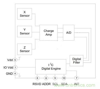 圖2:Kionix公司KXCJ9硅加速度計(jì)容納于在從第二貼合晶片在晶片級(jí)別創(chuàng)建一個(gè)密閉的腔。一個(gè)單獨(dú)的信號(hào)處理ASIC上安裝有傳感元件,以進(jìn)一步降低傳感器的整體尺寸,產(chǎn)生了3&TImes;3&TImes;0.9毫米的LGA塑料封裝從1.8操作 - 3.6伏直流電源。穩(wěn)壓器用于保持對(duì)輸入電源電壓范圍內(nèi)恒定的內(nèi)部工作電壓。這樣,可以通過輸入電源電壓的范圍內(nèi)穩(wěn)定的工作特性,以從供給變異去除任何錯(cuò)誤,并消除了對(duì)外部電源調(diào)節(jié),進(jìn)一步降低了設(shè)計(jì)的整體尺寸。