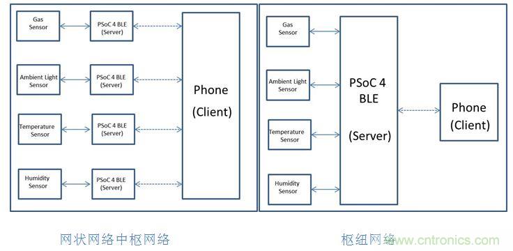 無線傳感器網絡通常作為網狀網絡和樞紐網絡(見圖1)。樞紐網絡包括可以放置在相同位置的所有傳感器。每個傳感器需要連接到單個BLE外圍設備(服務器)來處理數據并將其發(fā)送到BLE中央設備(客戶端)。網狀網絡采用可以遠程定位傳感器的拓撲結構。網格中的每個節(jié)點都需要連接到BLE外圍設備(服務器),所有這些外圍設備都可以連接到BLE中央設備(客戶端)。