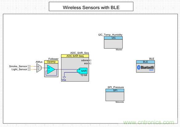 內置BLE功能的處理器的靈活性和豐富資源,使傳感器能夠與單一BLE設備連接。圖2是使用PSoC Creator的典型配置。PSoC Creator是一個用于圍繞PSoC架構開發(fā)應用程序的IDE。圖中顯示的是模擬和數字傳感器接口以及BLE子系統(tǒng)。該配置展示的是用于感測煙霧、光照強度、溫度、濕度和壓力的典型工業(yè)數據監(jiān)測系統(tǒng)。配置中的每個組件都有一個關聯的應用程序編程接口(API),開發(fā)人員可根據需要訪問這些組件。每個組件還有一個與其相關的數據表對組件的可用配置進行說明。