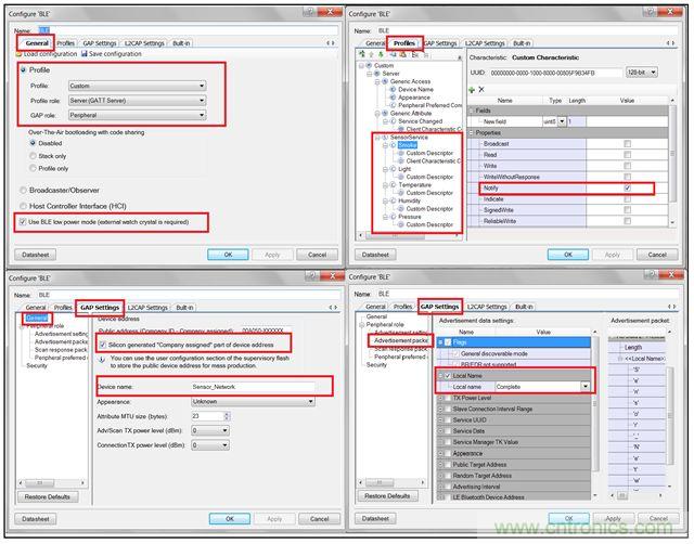 BLE組件在其GAP層中被配置為從設備。這使任何BLE設備(如BLE手機)都可以掃描此設備,在BLE從設備包含其名稱廣播時被BLE手機連接。此外,在其GATT層中,BLE設備被配置為具有自定義配置文件的GATT服務器。下面將討論BLE低功耗特性在該組件內啟用。名為“Sensor Service”的單一服務具有5種不同的特性,用于采集每個傳感器的數據。每個特性都具有通知功能,可以將傳感器數據作為通知發(fā)送。