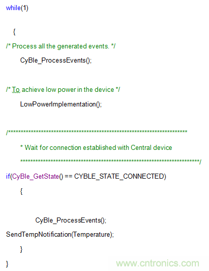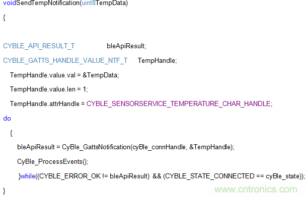 一旦兩個設備實現連接,就能使用連接間隔不同的通知發(fā)送數據。應用程序接口“CyBle_ProcessEvents()”應置于while(1)循環(huán)中,且必須在每個連接間隔中至少調用一次。我們也可以調用在同一while循環(huán)中將數據作為通知發(fā)送的函數。以下函數可用于將溫度數據的一個字節(jié)作為通知發(fā)送。這也適用于其他傳感器特性。