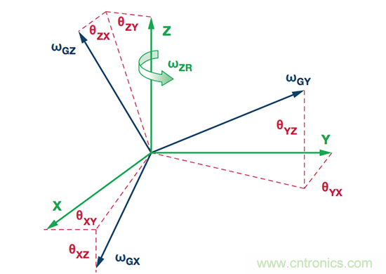 運(yùn)動(dòng)控制系統(tǒng)通常會(huì)建立慣性參考系,其中包含三個(gè)相互垂直90°的軸。這三個(gè)軸為MEMS IMU中的各個(gè)傳感器提供方位參考。理想情況下,陀螺儀的各個(gè)旋轉(zhuǎn)軸將與系統(tǒng)參考系中的軸完全對齊,將IMU安裝到平臺上之后,其將監(jiān)視運(yùn)行情況。這種情況下,在慣性參考系中圍繞其中一個(gè)軸旋轉(zhuǎn),只有該軸的陀螺儀會(huì)生成響應(yīng)。實(shí)際操作中,無法實(shí)現(xiàn)這種效果,因?yàn)闄C(jī)械缺陷必定會(huì)造成一些對齊誤差,從而導(dǎo)致離軸陀螺儀響應(yīng)慣性參考系中圍繞一個(gè)軸的旋轉(zhuǎn)運(yùn)動(dòng)。量化此響應(yīng)需要一些三角恒等式,并謹(jǐn)慎定義陀螺儀的對齊誤差。