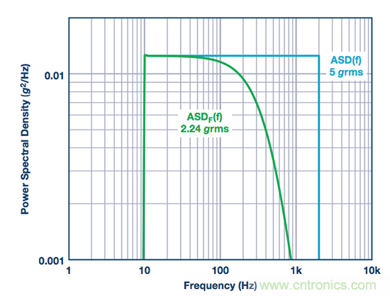 全帶寬配置匹配與ADIS16488A針對固有傳感器噪聲的0.135°/s(rms)的輸出噪聲規(guī)格相關(guān)的條件。對于振動(dòng)貢獻(xiàn),圖3給出了曲線說明ASD(f)以及濾波曲線ASDF (f)。ASDF (f)中的頻率響應(yīng)反映了與此IMU陀螺儀信號路徑中雙極點(diǎn)(404 Hz,757 Hz)低通濾波器相關(guān)的衰減曲線。