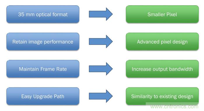 為了在保留35 mm光學格式的同時,將器件(例如KAI-29050)的分辨率從現(xiàn)有的2900萬像素繼續(xù)提升,就需要更小的像素格式,以便將更多像素放置于給定區(qū)域中。但為同時保留這一較小像素中的關鍵成像參數(shù),如圖像均勻性、動態(tài)范圍和底噪,除了簡單地縮小尺寸外,還需要提升像素設計。