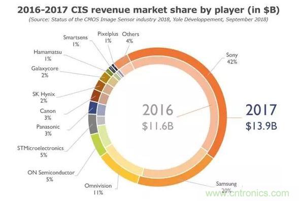 據(jù)麥姆斯咨詢介紹,CMOS圖像傳感器(CIS)已成為半導體產業(yè)的關鍵器件。這不僅是因為所涉及的技術及其帶來的市場營收,而是因為現(xiàn)在已經無法想象智能手機、汽車甚至是房屋如果沒有攝像頭的支持會怎樣。根據(jù)Yole最新發(fā)布的《CMOS圖像傳感器產業(yè)現(xiàn)狀-2018版》報告,2017年CIS產業(yè)的市場規(guī)模達到了139億美元,預計未來5年的復合年增長率(CAGR)將達到9.4%。