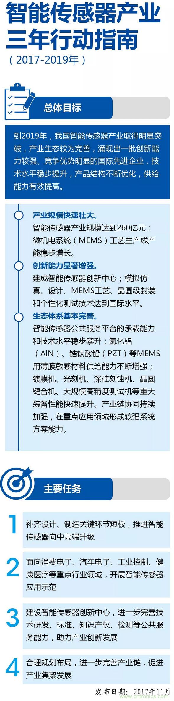 2017年,工信部發(fā)布了《智能傳感器產(chǎn)業(yè)三年行動(dòng)指南(2017-2019年)》,提出了要在智能終端、物聯(lián)網(wǎng)、汽車(chē)電子等工業(yè)領(lǐng)域有所發(fā)展。據(jù)有關(guān)專家預(yù)計(jì)2019年中國(guó)的智能傳感器產(chǎn)值將達(dá)到35億美元,國(guó)產(chǎn)智能傳感器所占比重將達(dá)到25%以上,比之前比重提高一倍。