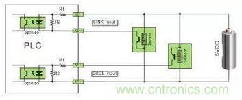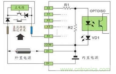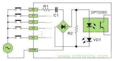 直流電可以由PLC內(nèi)部提供也可以外接直流電源提供給外部輸入信號(hào)的元件。R2在電路中的作用是旁路光電耦合器內(nèi)部LED的電流,保證光電耦合器LED不被兩線制接近開(kāi)關(guān)的靜態(tài)泄漏電流導(dǎo)通。