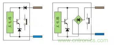 直流兩線制接近開(kāi)關(guān)分二極管極性保護(hù)與橋整流極性保護(hù),前者在接PLC時(shí)需要注意極性,后者就不需要注意極性。有源舌簧磁性開(kāi)關(guān)主要用在汽缸上做位置檢測(cè),由于需要信號(hào)指示,內(nèi)部有雙向二極管回路,因此也不需要注意極性;交流兩線制接近開(kāi)關(guān)就不需要注意極性。如圖10: