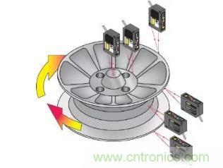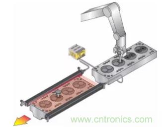 在流程的下一步驟之前驗(yàn)證關(guān)鍵部件是否到位并處于正確位置是一項(xiàng)常見要求。光電傳感器可以輕松實(shí)現(xiàn)這一目標(biāo),最新型號甚至可以檢測零件的最小和最窄邊緣。在圖示中,兩個傳感器可以形成僅為百分之一英寸的會聚點(diǎn),以精確地檢測半導(dǎo)體晶片的邊緣。在該示例中,傳感器不僅驗(yàn)證晶片的存在,而且還可以檢測晶片是否在盒中傾斜。