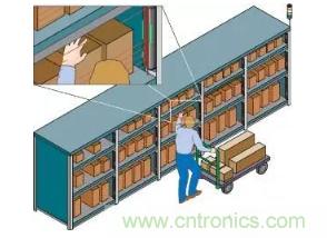 順序手動裝配中人的準(zhǔn)確性也是防錯的一個大問題。PLC控制的“揀選”系統(tǒng)使用指示下一個要選擇的項(xiàng)目的燈,以及每個箱前面的光幕來驗(yàn)證是否已經(jīng)采取了正確的部件。這些系統(tǒng)通過減少錯過的零件以及以錯誤順序組裝的零件來提高裝配操作的質(zhì)量百分比。除了裝配過程的防錯之外,它們還通過在裝配過程中始終驗(yàn)證裝配工最后停止的位置來提高工人效率,即使在休息或停工之后也是如此。這種完全可視化的通信系統(tǒng)也是一種全球解決方案,可消除語言障礙和技術(shù)能力等培訓(xùn)障礙。該圖顯示了倉庫應(yīng)用程序。