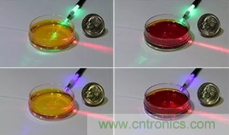 圖2:實(shí)驗(yàn)演示圖四宮格:在一組實(shí)驗(yàn)中,培養(yǎng)皿中裝有酚紅溶液,酚紅溶液的顏色根據(jù)酸度變化(深黃色表示pH值?。患t色表示pH值較大)。根據(jù)它的顏色變化,可以判斷液體吸收的綠光和藍(lán)光孰多孰少。吸收光后液體的溫度變化,可以通過光纖探頭來測量,由于可以判斷確切的液體顏色,從而可以評估pH值。